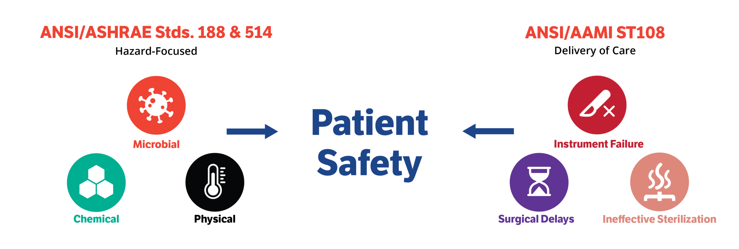 First, let’s highlight the differences between how these standards define “risk” itself. ANSI/ASHRAE 188 is focused on the risk of patients acquiring a dangerous pathogen from building water. ANSI/AAMI ST108 looks at this same risk to patients, but also covers “process risk,” or the risk that your water quality may negatively impact the process of your SPD operations. This includes the risk of your instruments not being sufficiently cleaned, becoming corroded or stained, or your equipment failing. Your definition of risk should be expanded to include all of these considerations. If it can impact your ability to effectively reprocess instruments, it is a risk.